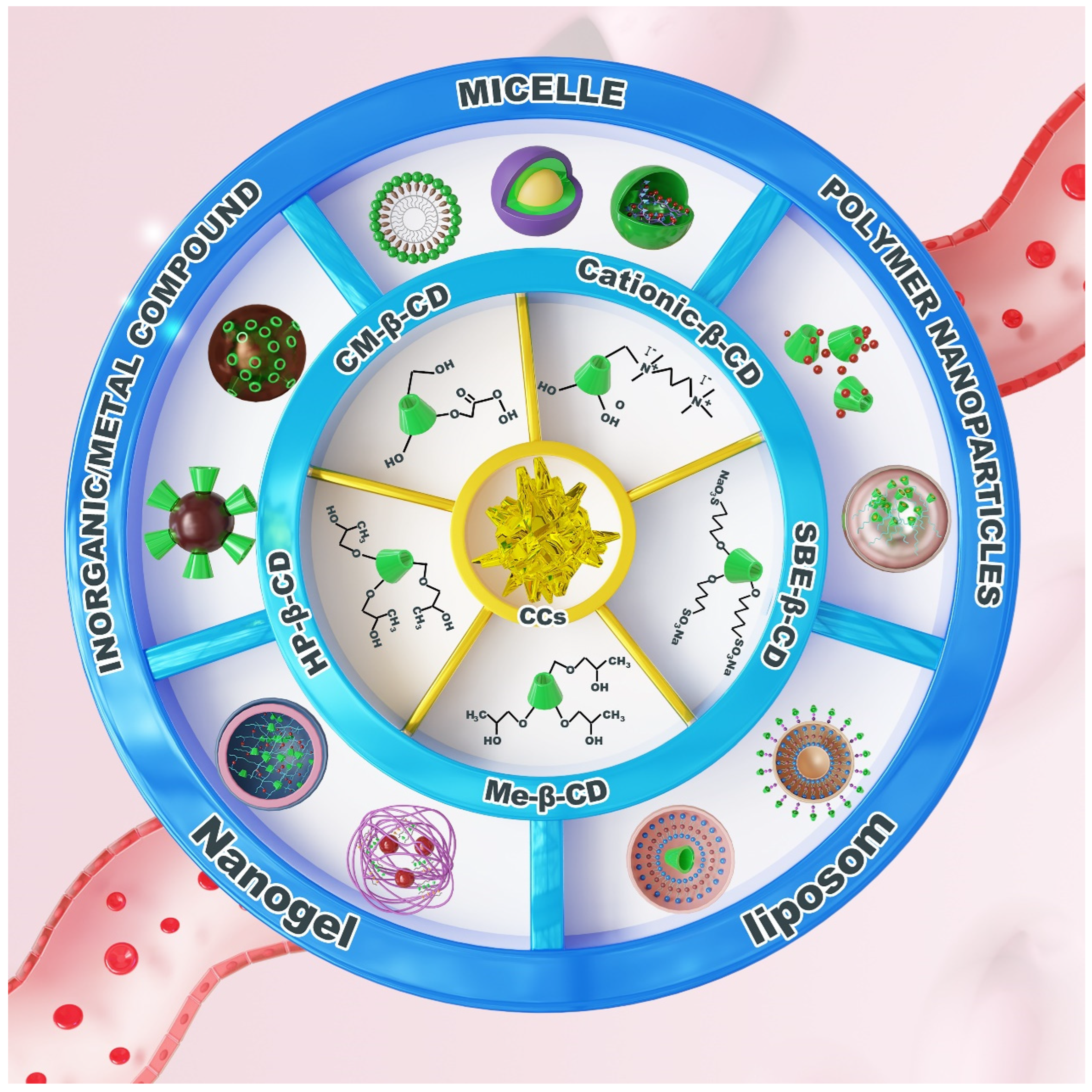 - Dai, Z.; Yang, H.; Yin, P.; Liu, X.; Zhang, L.; Dou, Y.; Sun, S. Applications of Cyclodextrin-Based Drug Delivery Systems in Inflammation-Related Diseases. Pharmaceutics 2025, 17, 378. [Google Scholar] [CrossRef]