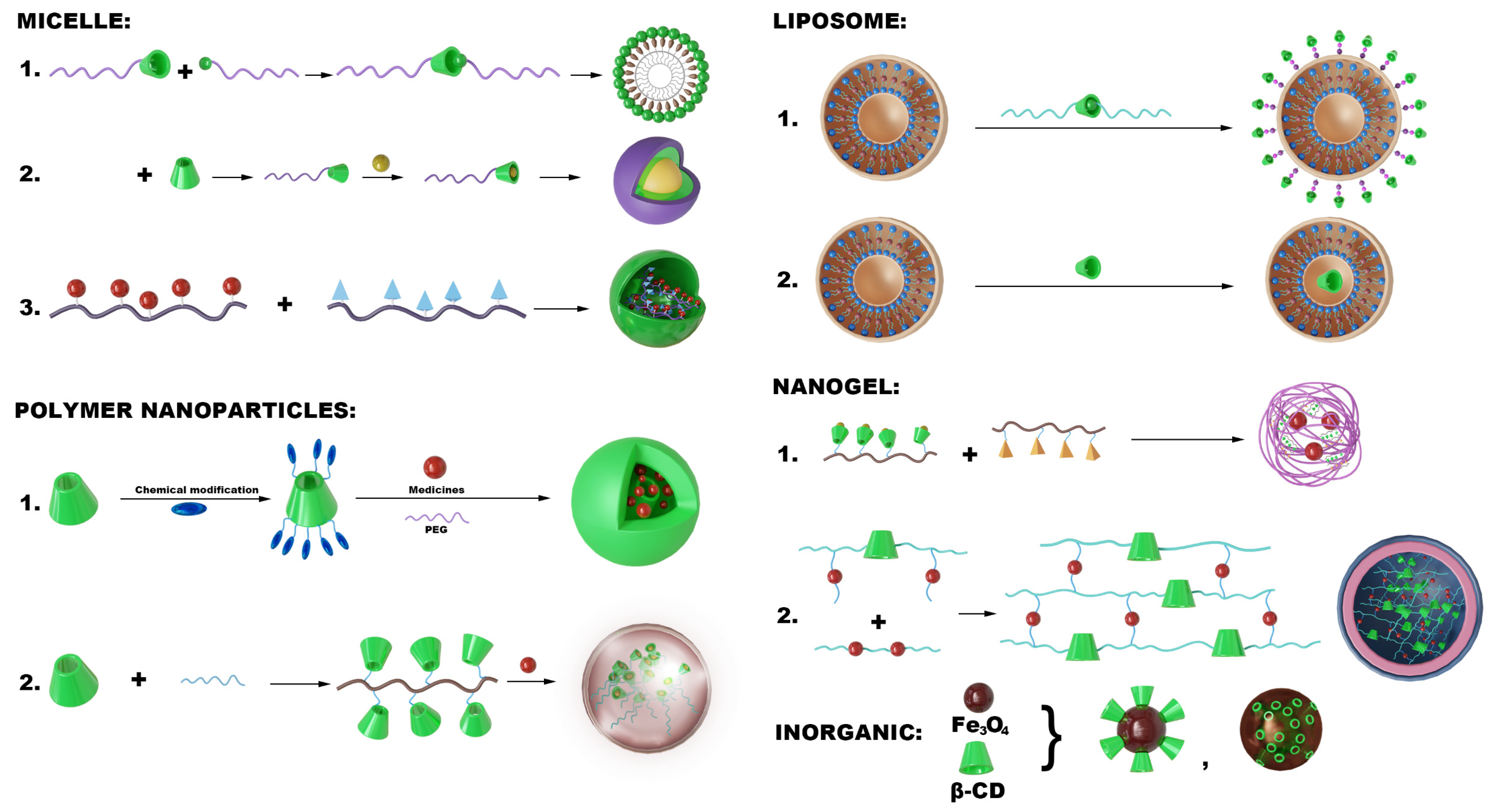 | HP-β-CD | Micelle | MTX NPs | Methotrexate (antimetabolite anticancer drug) | Host–guest recognition | Male Sprague-Dawley rats | Oral gavage | Enhanced drug solubility, improved encapsulation | Dissolve cholesterol crystals | [152] |