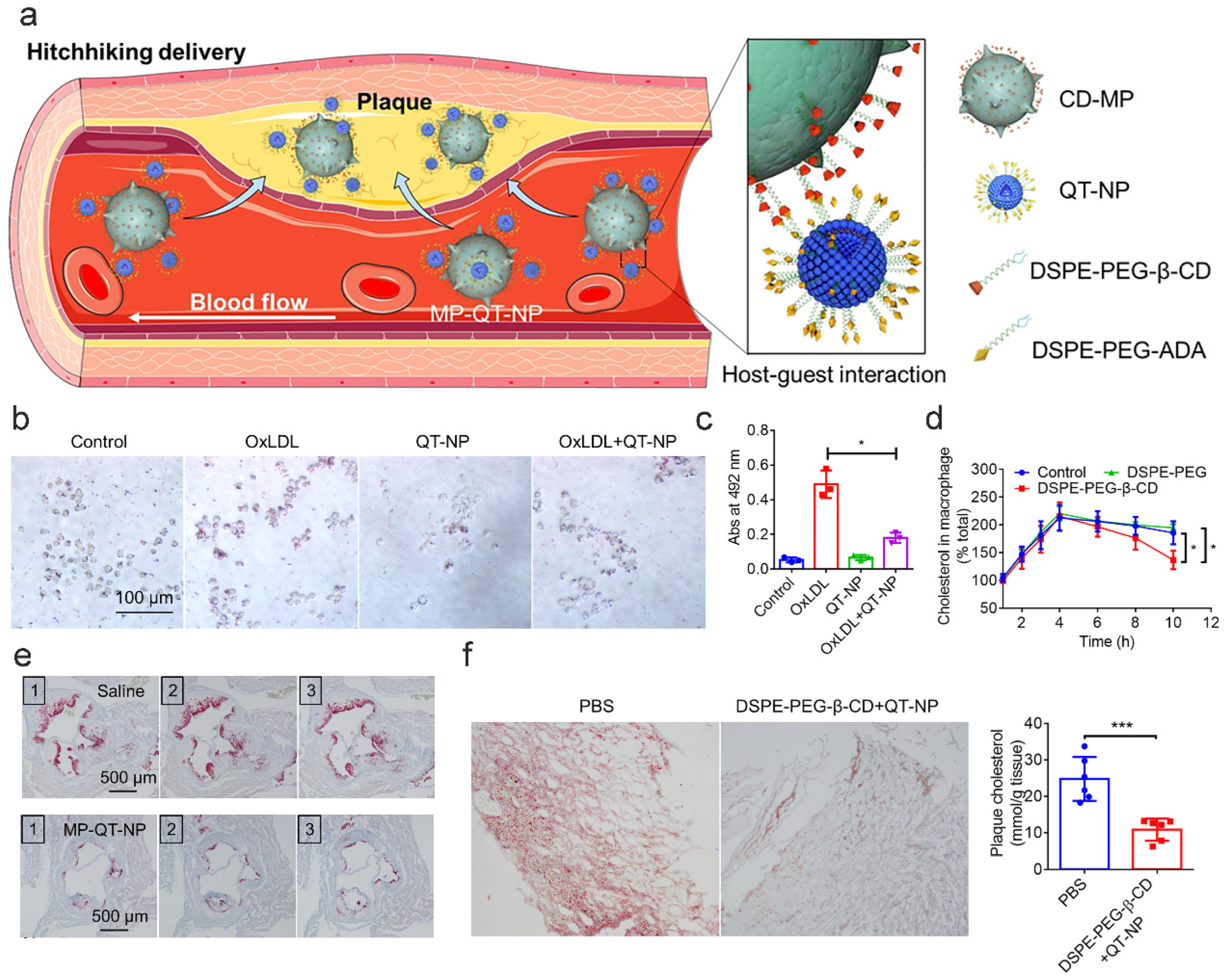 | β-CD | Micelle | MM@MTX NPs | MTX (immunosuppressant) | Cell membrane | ApoE−/− mice (apolipoprotein E gene knockout mice) | Tail vein injection | Host–guest recognition; controlled release | Promote cholesterol dissolution and efflux, inhibit foam cell formation | [102] |