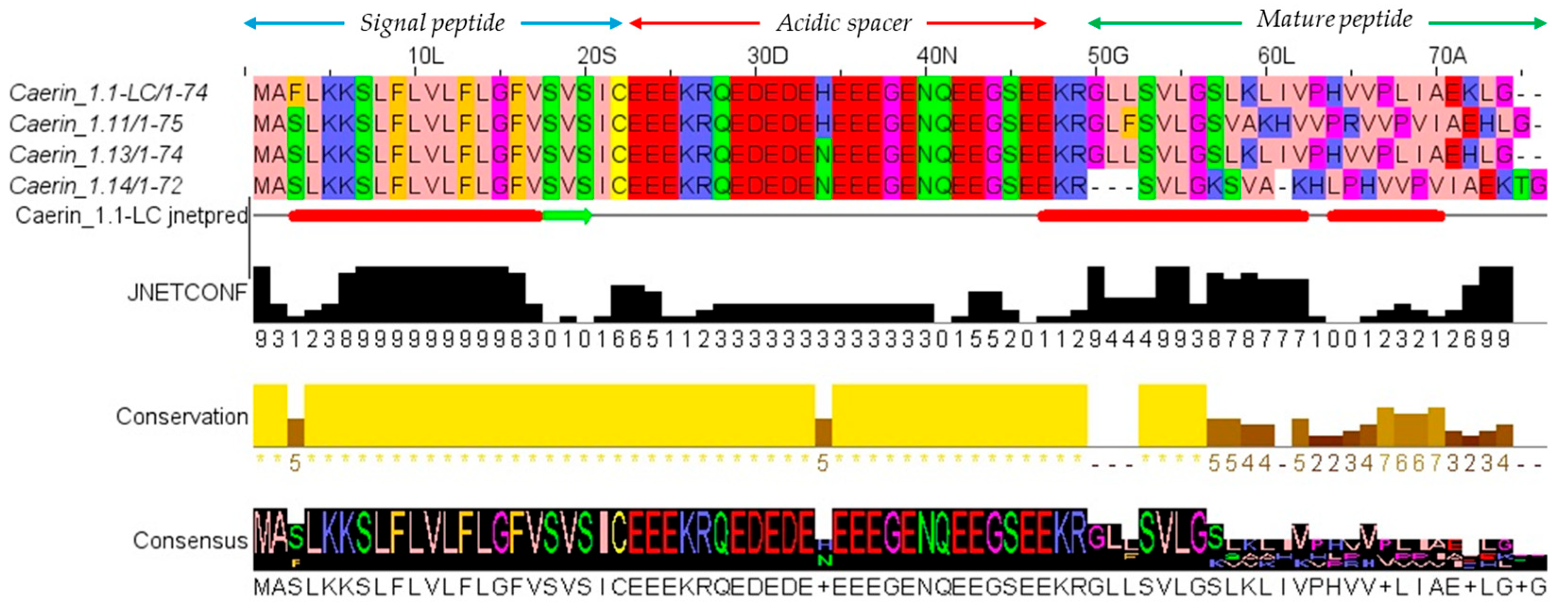3.1. Molecular Cloning of Caerin 1.1-LC Precursor-Encoding cDNA