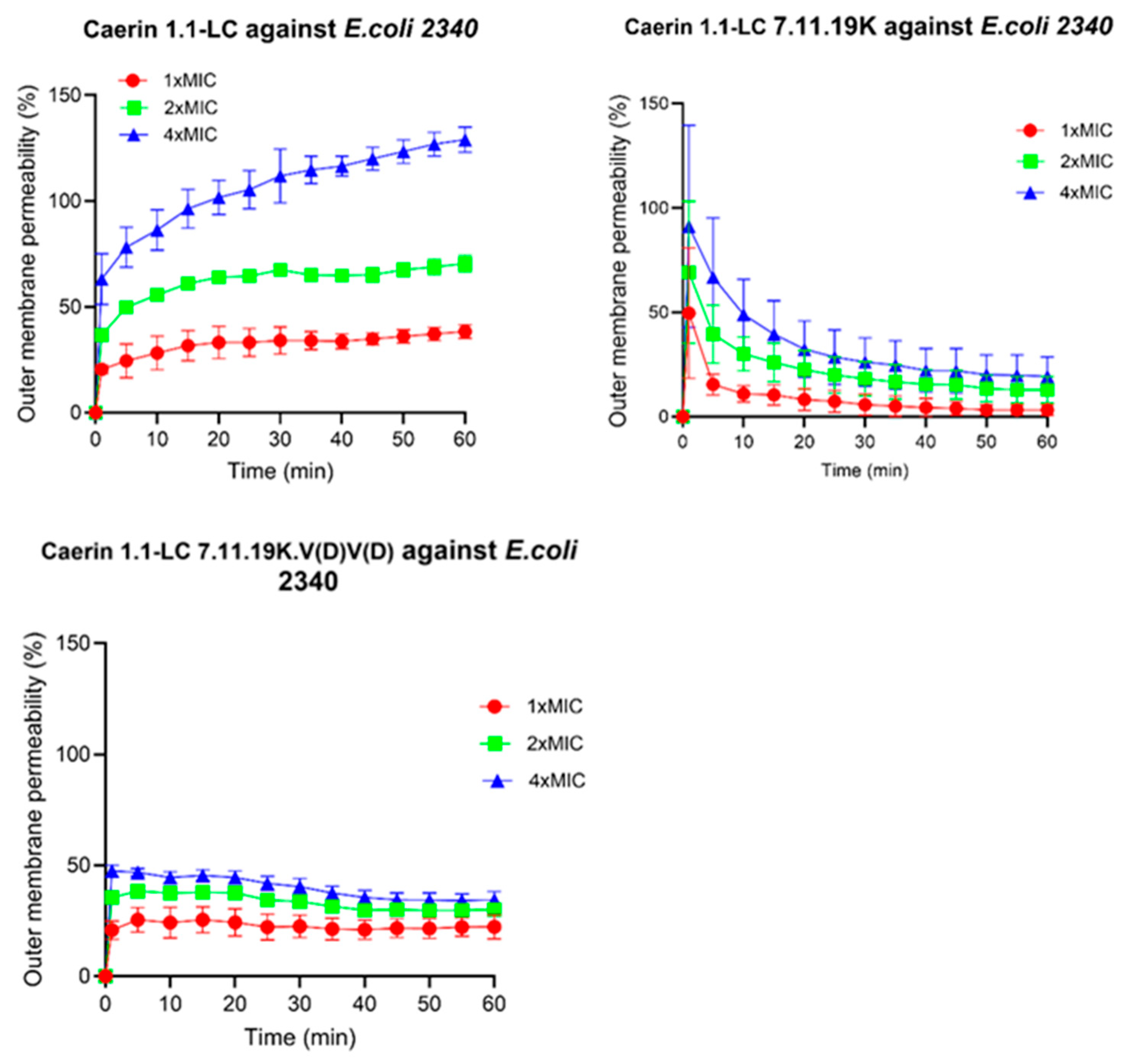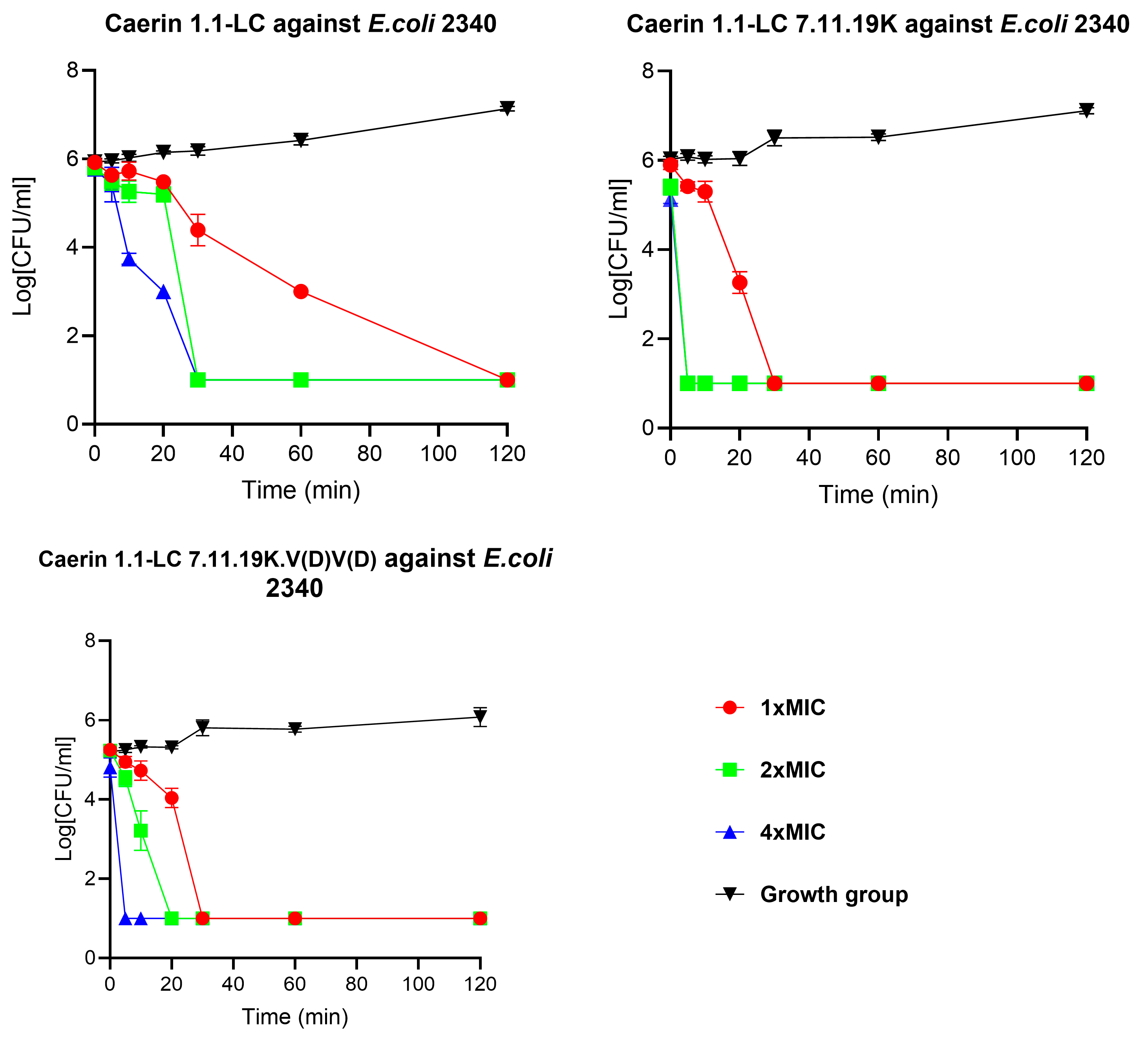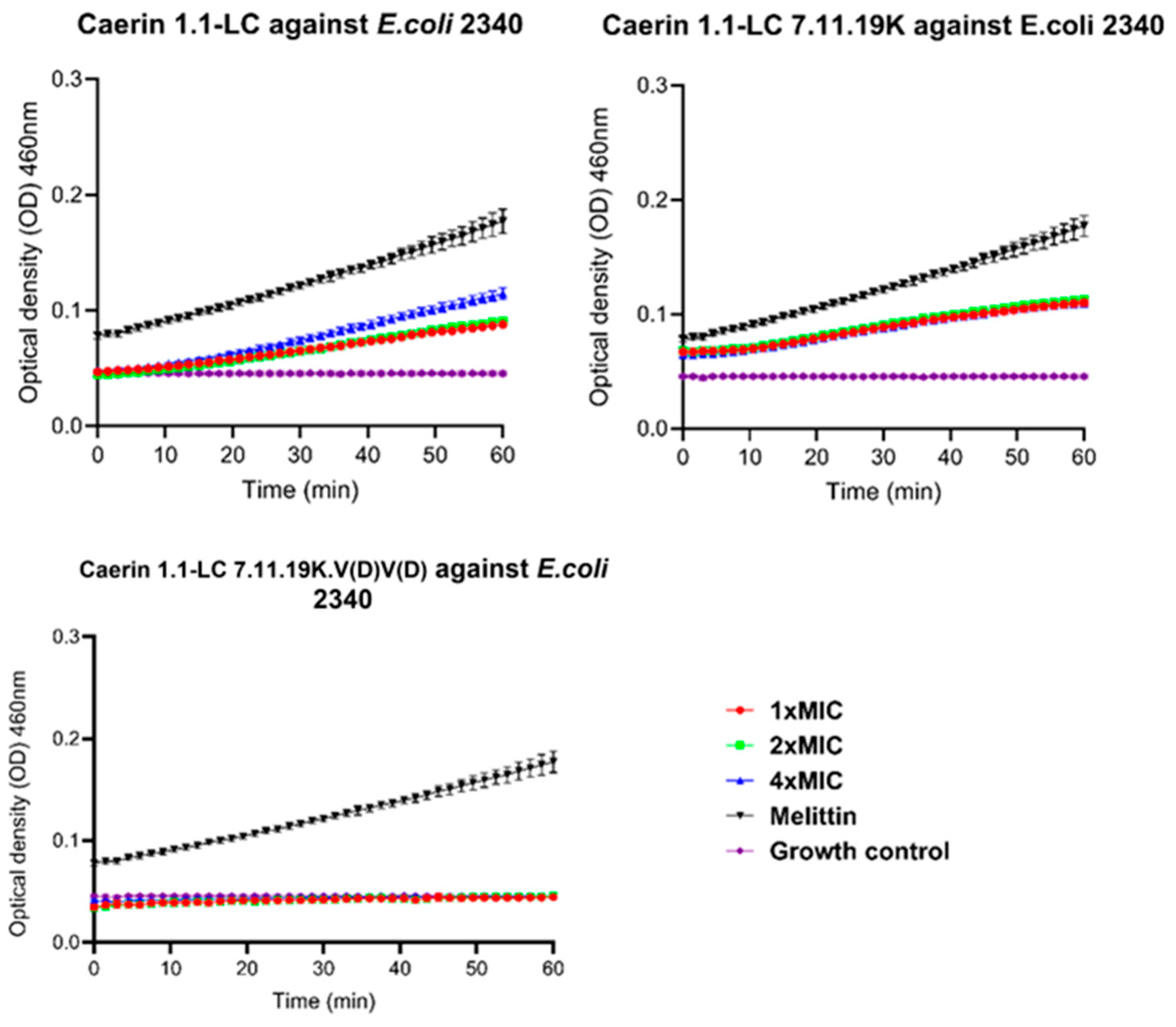 | Caerin 1.1-LC PKAL(D)P | 43.4 | 4.87 | 64 | 8.91 | 0.68 |