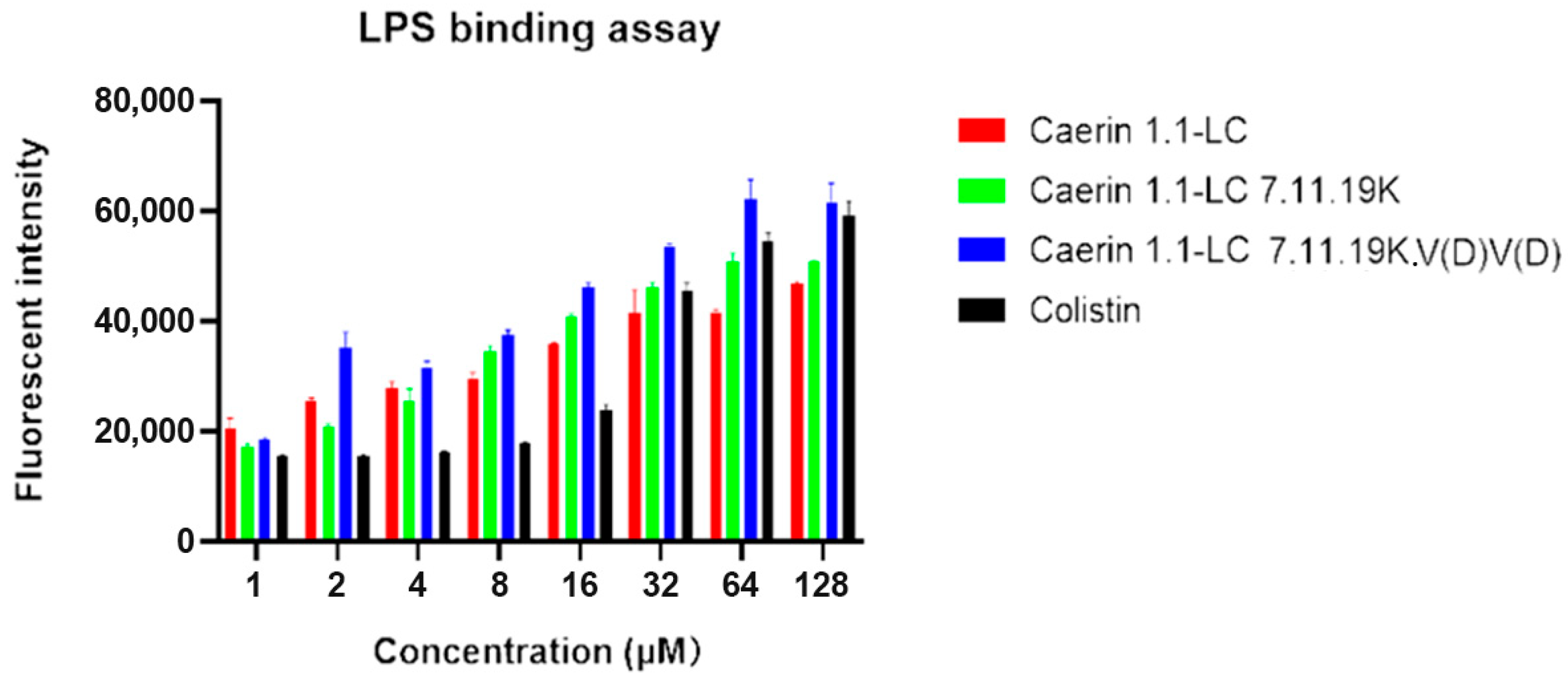 | Caerin 1.1-LC 11K.19K.PKAVP | 8/8 | 8/8 | 2/2 | 64/64 | >128 | 32/64 | 128/128 | >128 | >128 | 64/64 |