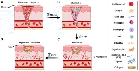 Multiscale illustration and experimental validation of the wound healing process. Schematic representation of four consecutive wound healing phases: (A) Hemostasis and coagulation, (B) inflammation, (C) proliferation, and (D) regeneration/maturation, with major cellular and extracellular components indicated. Reprintied with permission from Ref. [5]. 2024, Biotechnology.