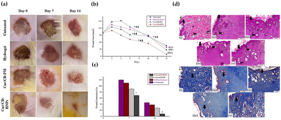 In vivo and histological evaluation of Cur/CD-HNPs demonstrating biocompatibility and tissue adhesion in burn wound healing. (a) Representative wound photographs taken on days 0, 7, and 14 for the untreated, hydrogel, Cur/CD-PM, and Cur/CD-HNP groups. (b) Quantitative analysis of wound area reduction over 14 days. Statistical symbols indicate significant differences at each time point: * p < 0.05 vs. untreated; # p < 0.05 vs. Cur/CD-PM; $ p < 0.05 vs. hydrogel. (c) Wound contraction (%) on days 7 and 14. (d) Histopathological evaluation of skin tissues: (i–v) H&E staining showing re-epithelialization, reduced edema, and regeneration of dermal and adnexal structures—including newly formed epidermal layers, restored hair follicles, and diminished inflammatory cell infiltration—highlighted by black arrows; (i–v) Masson’s Trichrome staining indicating organized collagen deposition and restored connective tissue architecture in the Cur/CD-HNP treatment group. Reprinted with permission from Ref. [15]. 2025, BMC Biotechnology.