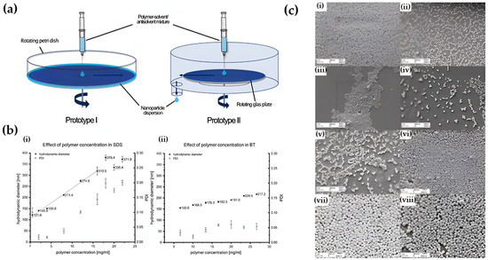 Because nanoprecipitation outcomes reflect the coupled kinetics of nucleation and growth, parameter sweeps (polymer concentration, solvent–water ratio, flow rate, temperature, and mixing intensity) should be explicitly linked to particle size, polydispersity, and encapsulation efficiency. Protease- and salt-rich exudate can be irritated by residual solvent and surfactant, and stability in DI water under static conditions is rarely a reliable indicator of performance under cyclic hydration and shear. Therefore, the zeta potential and release profiles in exudate-like media, mass balance for loading and recovery, and post-sterilization stability should all be included in decision-ready reports [60]. A representative process and parameter effects are illustrated in Figure 3. Evaporation-triggered nanoprecipitation involves injecting a polymer–solvent/antisolvent mixture onto a rotating substrate, where rapid solvent diffusion induces polymer desolvation and nucleation (Figure 3a). Dynamic light scattering (Figure 3b) shows that the type of stabilizer and the concentration of the polymer have a big effect on the hydrodynamic diameter and the polydispersity index. As the concentration of polymers rises, regimes dominated by growth emerge, resulting in a higher PDI, which aligns with the previously discussed supersaturation kinetics. Scanning electron microscopy shows different shapes of nanoparticles and how they stay the same under different polymer and solvent conditions (Figure 3c). This confirms that the best compositions make spherical and monodisperse PLGA nanoparticles [61].