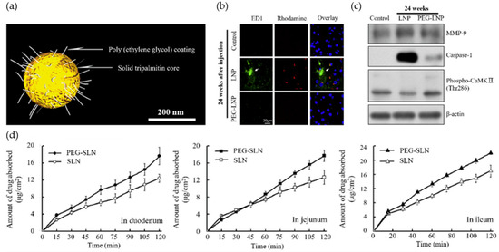 LNP functionality modulated by polymer-based surface modification. (a) Schematic illustration of PEG-stabilized LNPs composed of a solid tripalmitin core and a PEG coating. (b) Immunofluorescence images showing mitigation of neurovascular damage following PEG-LNP administration. FD1 (green) visualizes fluorescein–dextran leakage across the vascular barrier, Rhodamine (red) labels vascular structures, and DAPI (blue) stains nuclei. PEGylation reduces FD1 extravasation, indicating improved neurovascular integrity. (c) Immunoblot analysis of mouse brain tissue 24 h after injection, probed for MMP-9 (blood–brain barrier integrity), caspase-1 (inflammation), and phospho-CaMKII (synaptic signaling), with β-actin as a loading control. (d) Absorptive characteristics of SLN and PEG-SLN in the everted rat gut sac system across the duodenum, jejunum, and ileum, showing enhanced and more consistent absorption for PEG-SLN. Reproduced with permission from Ref. [77]; Copyright 2023, Bioengineering.