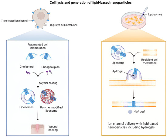 Cell lysis and LNP generation with hydrogel-assisted delivery. Panels show the following elements: TFH and EI production with size tuning by extrusion or HPH, optional PEG post-insertion membrane fragments providing cholesterol, and PL that assemble into liposomes or polymer-modified liposomes for wound healing, using hydrogel-assisted landing of a liposome on a recipient membrane with insertion of an ion channel [82]. Reproduced with permission from Ref. [82]; Copyright 2023, Functional Biomaterials.