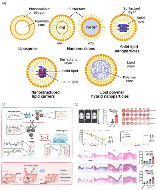 Comparative illustration of lipid nanoparticle-based platforms and their applications in wound repair. (a) Structural schematics of major lipid nanoparticle formulations, including liposomes, nanoemulsions, solid lipid nanoparticles (SLNs), nanostructured lipid carriers (NLCs), and lipid–polymer hybrid nanoparticles. (b) Representative polymer–lipid–hydrogel hybrid assembly and wound-targeted delivery mechanism illustrating pH-activated PDA–Cur release, PEGDA–CHLA crosslinking, and tissue adhesion properties. (c) In vivo wound-healing efficacy and histological analysis demonstrating accelerated wound closure and enhanced regeneration following NLC-based treatment. Black dots indicate wound boundary markers used to delineate the region of interest. Graphs include statistical comparisons. Reproduced with permission from ref. [9]; Copyright 2023, ACS Materials Au.