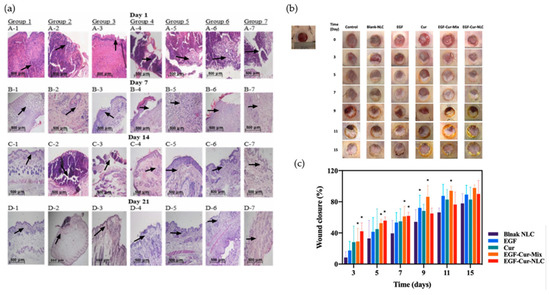 In vivo assessment of wound healing efficacy and histological analysis of EGF–Cur–NLC treatment. (a) Typical wound images of diabetic rats treated with Blank NLC, EGF, Cur, EGF–Cur–Mix, and EGF–Cur–NLC formulations over 15 days, showing progressive closure and scab reduction. Arrows indicate key histopathological features including re-epithelialization fronts, granulation tissue formation, and collagen deposition areas. (b) Quantitative wound-closure analysis (%) showing that EGF–Cur–NLC had a significantly higher healing rate than other formulations over 15 days. Asterisks (*) denote statistically significant differences compared with the Blank NLC group (* p < 0.05). (c) Histopathological analysis of skin sections from days 1 to 21 post-treatment, demonstrating re-epithelialization, collagen deposition, and angiogenesis in the EGF–Cur–NLC group. Arrows highlight regenerated dermal structures and newly deposited collagen fibers. Reprinted with permission from Ref. [114]. Copyright 2023, Pharmaceutics.