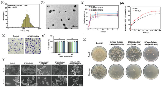 Representative experimental data illustrating multifunctional therapeutic actions of polymer- and lipid-based nanostructures in wound healing. (a) Particle size distribution of LNPs (~150 nm, PDI 0.17). (b) TEM image confirming spherical morphology. (c) Swelling behavior of SFMA/rColMA hydrogels with varying compositions. (d) Cumulative AMP release profiles under PBS- and ROS-rich (H2O2) conditions. (e) Fibroblast morphology after incubation on hydrogel surfaces. (f) Cell-viability analysis at 24 h and 48 h showing excellent cytocompatibility, with ‘ns’ indicating no significant difference and the bar colors representing each tested formulation. (g) Antibacterial activity against E. coli and S. aureus after treatment with LNP@AMP hydrogels at different concentrations. (h) SEM micrographs showing membrane disruption of bacteria after exposure to SFMA/rColMA/LNP@AMP or SFMA/rColMA/LNP@PUE composites, with arrows indicating sites of membrane damage. Reprinted with permission from Ref. [119]. 2024, Advanced Science.