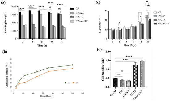 Quantitative characterization of chitosan–alginate composite hydrogels incorporating ascorbic acid (AA) and tannic acid (TP). (a) Swelling behavior showing rapid hydration within 2 h and reduced water uptake in AA/TP-modified hydrogels. (b) Cumulative release profiles of AA and TP demonstrating sustained release over 120 h. (c) Controlled biodegradation profile indicating moderate mass loss (≤40%) over 21 days. (d) Cell viability (MTT assay) confirming excellent cytocompatibility of AA/TP formulations relative to control groups. Statistical significance indicators: * p < 0.05, ** p < 0.01, *** p < 0.001, **** p < 0.0001, ns = not significant. Reprinted with permission from Ref. [164]. 2023, BMC.