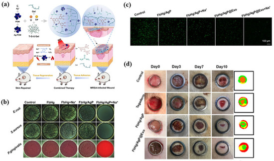 Multifunctional Ag–polyoxometalate (Ag-POM) hydrogel nanocomposites for infected-wound healing. (a) Schematic of Ag-POM/gelatin–urea hydrogel showing catalytic and photothermal antibacterial effects. (b) Antibacterial activity against E. coli, S. aureus, and P. gingivalis. (c) Live/dead fluorescence images of bacteria after hydrogel treatments. (d) Wound-closure images over 10 days showing markedly accelerated healing in the FbHg/AgP@Exo and FbHg/AgP@Exo + Na⁺ treatment groups. The color-coded maps on the right visualize wound-area quantification, where green represents the initial wound boundary, yellow indicates intermediate healing, and red denotes the remaining unhealed area. Reprinted with permission from Ref. [190]. 2022, Elsevier.