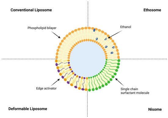 Schematic representation of liposomal architecture for topical and transdermal delivery. Conventional liposomes consist of a phospholipid bilayer surrounding an aqueous core. Deformable liposomes incorporate edge activators, such as sodium cholate or polysorbates, that enhance bilayer fluidity and facilitate passage through narrow pores. Ethosomes contain ethanol within the bilayer, which increases membrane permeability and improves skin penetration. Niosomes are formed from nonionic surfactants, providing a phospholipid-free and chemically stable alternative.