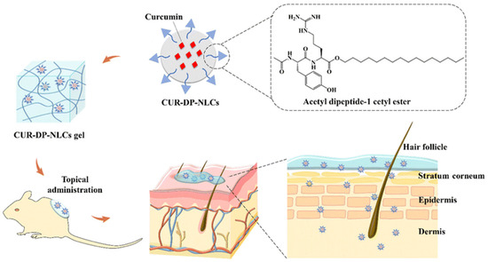 - Yuan, M.; Niu, J.; Li, F.; Ya, H.; Liu, X.; Li, K.; Fan, Y.; Zhang, Q. Dipeptide-1 modified nanostructured lipid carrier-based hydrogel with enhanced skin retention and topical efficacy of curcumin. RSC Adv. 2023, 13, 29152–29162. [Google Scholar] [CrossRef]