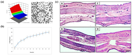 Characterization, release behavior, and skin tolerance of hydrocortisone-loaded lipid–polymer hybrid nanoparticles (HCL-LPHNs). (a) 3D response surface plot and TEM image showing uniform spherical nanoparticles within the optimized size range. The color gradient in the surface plot represents changes in particle size across the tested formulation variables. (b) Cumulative drug-release profile indicating sustained release of HCL over 24 h. (c) Histological sections (A–D) of rat skin after topical application of L-PHHN formulations showing intact epidermal and dermal layers without significant irritation or inflammatory changes. Reprinted with permission from Ref. [215]. 2023, ACS Publications.