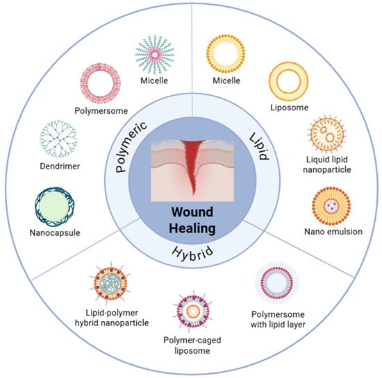 Nanostructures for wound healing can be categorized into three groups: polymeric, lipid-based, and hybrid. Some examples of representative systems are polymersome, micelle, dendrimer, nanocapsule, liposome, solid lipid nanoparticle, nanostructured lipid carrier, and polymer–lipid hybrid vesicle. The plan stresses how each structure is built to help the skin heal, control inflammation, and make it easier for drugs to enter and stay in.
