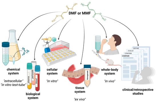 Various experimental approaches for investigating dimethyl fumarate and monomethyl fumarate effects. Abbreviations: DMF—dimethyl fumarate, MMF—monomethyl fumarate. Created in BioRender. Kopincova, J. (2025) https://BioRender.com/zp4szt8, accessed on 18 November 2025.