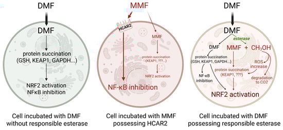 Simplified scheme comparing selected intercellular processes in the cells incubated with DMF or MMF. Cell possessing esterase for DMF hydrolysis is subjected to more effects due to MMF and methanol production. A small intercellular amount of less permeable MMF, followed by a lower effect, is depicted by small letters. Abbreviations: DMF—dimethyl fumarate, MMF—monomethyl fumarate, GSH—glutathione, KEAP1—Kelch-like ECH-associated protein 1, GAPDH—glyceraldehyde 3-phosphate dehydrogenase, NF-κB—nuclear factor κB, NRF2—nuclear factor erythroid 2-related factor 2, HCAR2—hydroxycarboxylic acid receptor 2. Created in BioRender. Kopincova, J. (2025) https://BioRender.com/zp4szt8, accessed on 18 November 2025.