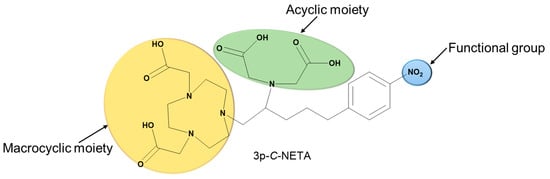 Structure of 3p-C-NETA showing the macrocyclic, acyclic and functional groups.