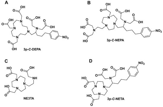 Structures of chelators incorporating macrocyclic and acyclic moieties. (A) 3p-C-DEPA; (B) 3p-C-NEPA; (C) NE3TA; (D) 3p-C-NETA.