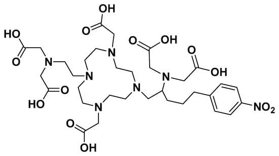 3p-C-DEPA (7-[2-(bis-carboxymethyl-amino)-ethyl]-4,10-bis-carboxymethyl-1,4,7,10-tetraazacyclododec-1-yl-acetic acid (Figure 4) is a chelator which incorporates both an acyclic iminodiacetic acid and macrocyclic DOTA [,]. The reason for developing this chelating ligand was to incorporate structural and functionalities of both acyclic and macrocyclic cores, i.e., fast complexation at mild temperatures (25 °C–37 °C) with radioisotopes and high stability in vivo. This hypothesis was confirmed with bismuth-205/206-labeled trastuzumab (205/206Bi-trastuzumab). 205/206Bi labeling of 3p-C-DEPA-trastuzumab conjugate was extremely rapid (1 min, RCY > 93%, 0.25 M NH4OAc, pH 5.5) at 25 °C. The complex remained intact in human serum (37 °C) up to 72 h with no measurable dissociated activity []. Good complexation kinetics (0.25 M NH4OAc, pH 4.0, 45 °C, 30 min) and excellent in vitro human serum stability (37 °C, >98% intact up to 48 h) of the DEPA chelator as such with 177Lu has also been reported [,].