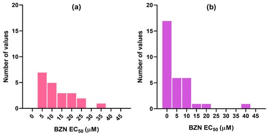 Distribution of BZN EC50s reported in the different studies from which the dataset compounds were retrieved for (a) trypomastigotes and (b) amastigotes.