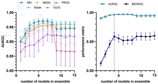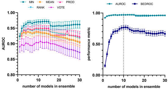 Evolution of AUROC vs. number of models (to identify trypanocidal compounds against trypomastigotes) incorporated into the model ensemble, considering different combination schemes (left). Evolution of average and early enrichment metrics (AUROC and BEDROC) vs. the number of models in the ensemble for the best-performing combination strategy (MIN operator) (right). The individual models are integrated into the ensemble according to their performance ranking in the first retrospective screening. The selected ensemble has been indicated with the vertical dashed line.