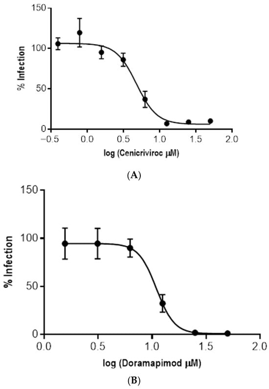 Among the remaining compounds, Cenicriviroc showed the strongest activity against intracellular amastigotes, with an EC50 value of 4.76 µM and a selectivity index greater than 10 (Figure 6 and Table 7).