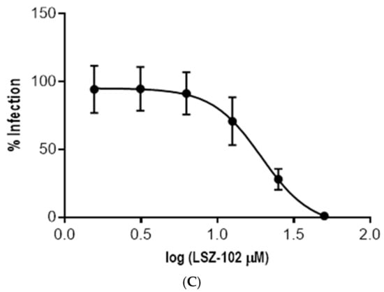Dose–response curves for the three compounds active against T. cruzi amastigotes that did not present cytotoxic activity against Vero cells. (A) Cenicriviroc. (B) Doramapimod. (C) LSZ-102.