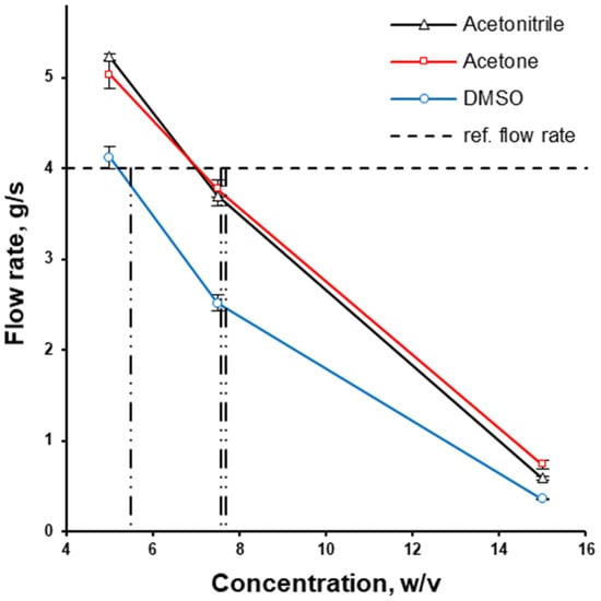 The effect of solvent type and concentration on the flow rate of HPMCAS solution; the utilised concentrations of HPMCAS solutions in organic solvents are depicted with vertical lines.