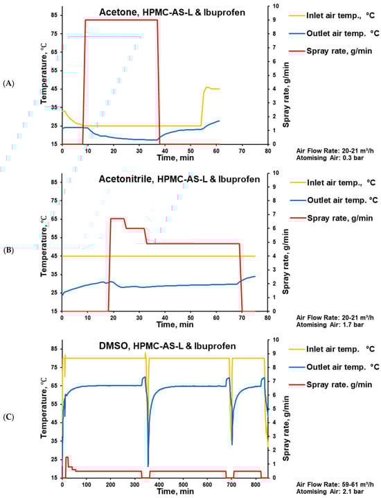 Parameters of placebo tablet coating process with HPMC-AS-L-based coating and ibuprofen using acetone (A), acetonitrile (B), and DMSO (C) as solvents.