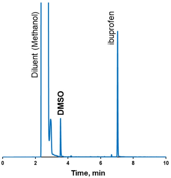 The boiling point of ibuprofen (157 °C) is lower than the boiling point of DMSO (189 °C). Because of the relatively low boiling point of ibuprofen, the thermal methods for the determination of the residual solvents, such as TGA, were not applicable. Using gas chromatography, acetone and acetonitrile were found in amounts below detectability limits, while the determined DMSO content comprised 1.5 wt.% of the coating (Figure 5, Table 3). It should be mentioned that, according to the ICH Q3C acceptance criteria, DMSO is a solvent classified as class 3—low toxic potential. And the upper consumption limit of class 3 residual solvents comprises 50 mg per day [].