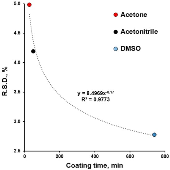The precision of ibuprofen dosing increased from acetone to acetonitrile and to DMSO. The increase in coating time from 28 to 739 min improved (decreased) the R.S.D. of dosing from 5.25 to 2.93% (Figure 7). This finding agrees with previously reported information [,,]. The R.S.D. for the uniformity of content time and its good fit to the power function (R2 = 0.9843) are in agreement with previously reported information [,]. So, for subsequent experiments with the same equipment and for scale-up, the coating duration time in combination with the spray rate can be considered to influence dosing precision.