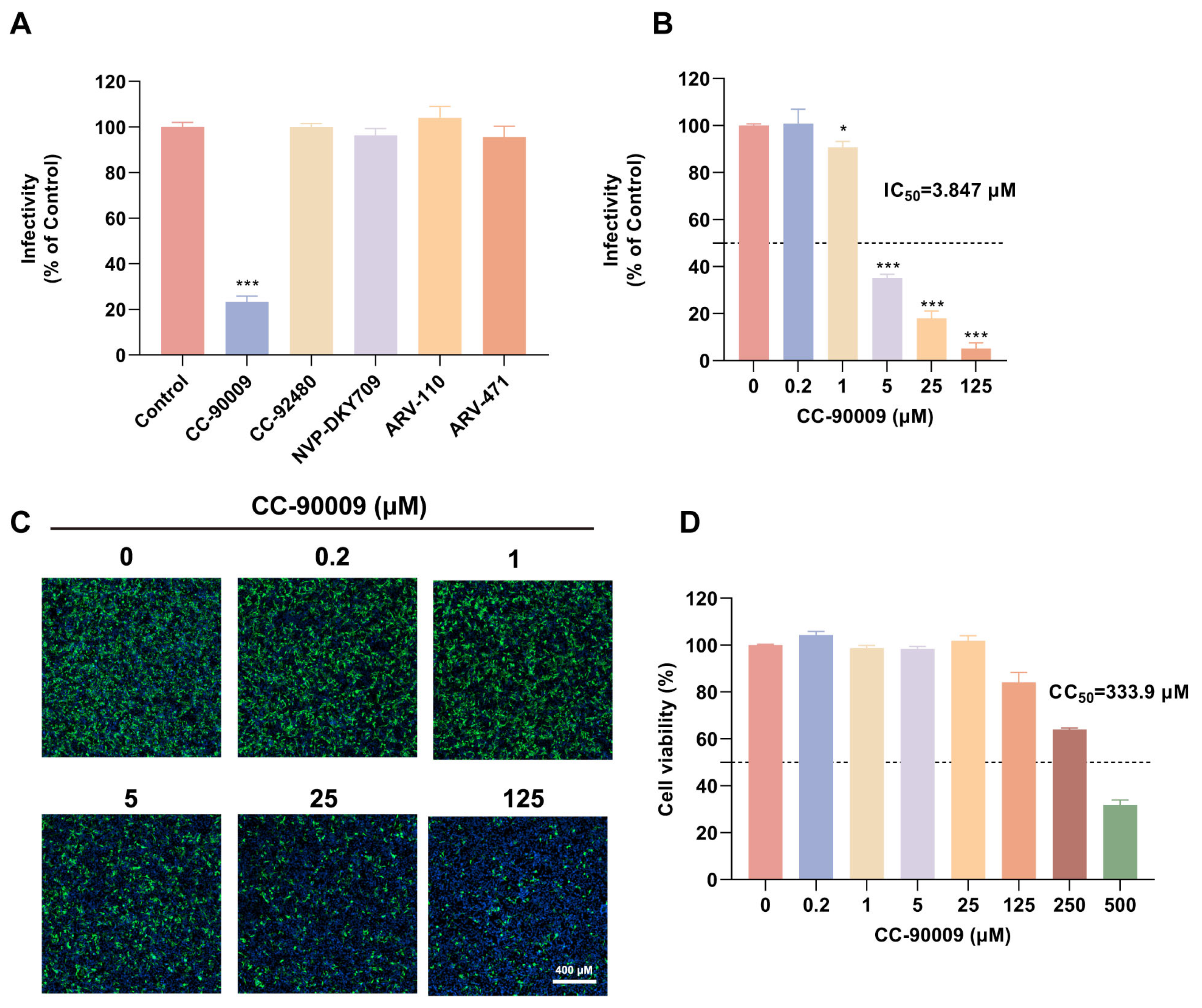 3.1. CC-90009 Potently Inhibits JEV Infection in SH-SY5Y Cells