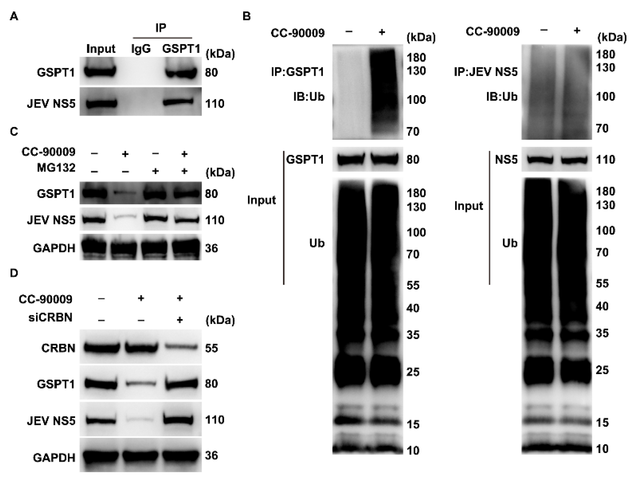Chicago/Turabian StyleHe, Zhiwei, Yibo Chen, Binghui Xia, Zimeng Cheng, Ping Zhao, Zhongtian Qi, and Yongzhe Zhu. 2025. "CC-90009, a Cereblon E3 Ligase Modulator, Exhibits Antiviral Efficacy Against JEV In Vitro and In Vivo via Targeted Degradation of GSPT1 and Viral NS5 Protein" Pharmaceutics 17, no. 12: 1524. https://doi.org/10.3390/pharmaceutics17121524