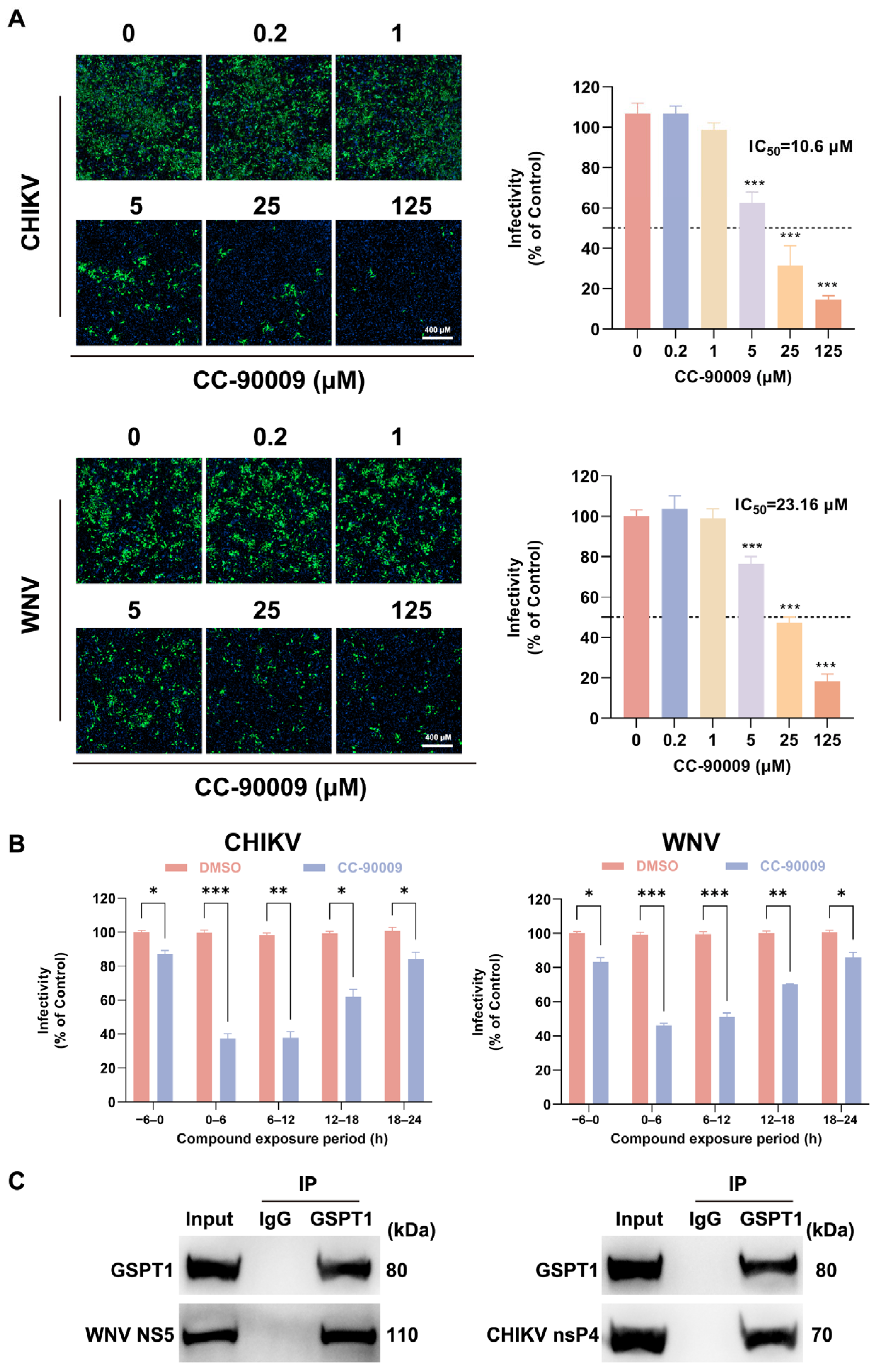 3.6. CC-90009 Exerts Broad-Spectrum Antiviral Activity Against Mosquito-Borne Viruses