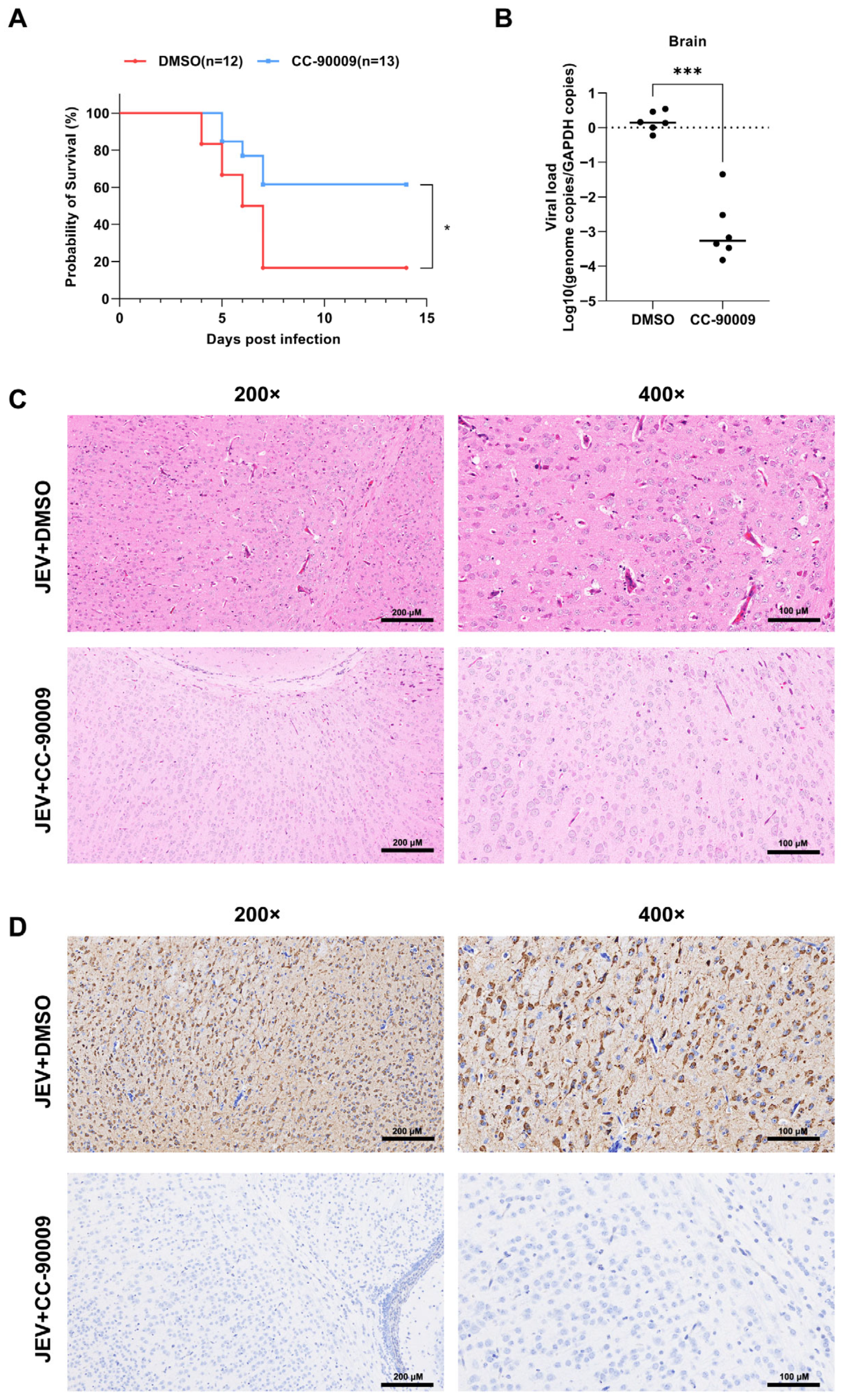 3.7. CC-90009 Confers Protection Against Lethal JEV Infection in Mice