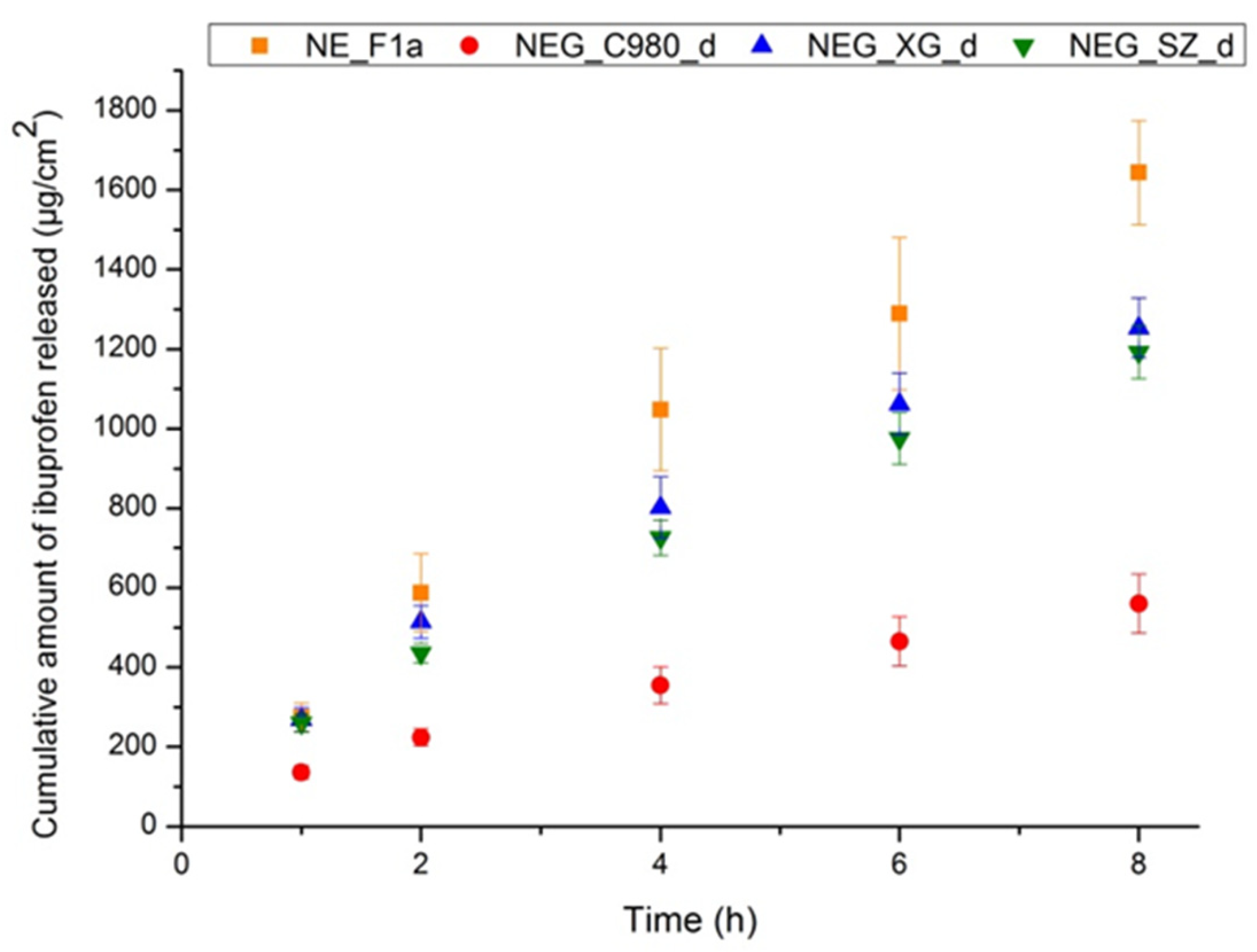 | Carbopol 980 | NEG_C980_d | 94.03 ± 0.63 c,f | 0.222 ± 0.008 b,f | −25.4 ± 2.9 e | 5.71 ± 0.01 c,f |
