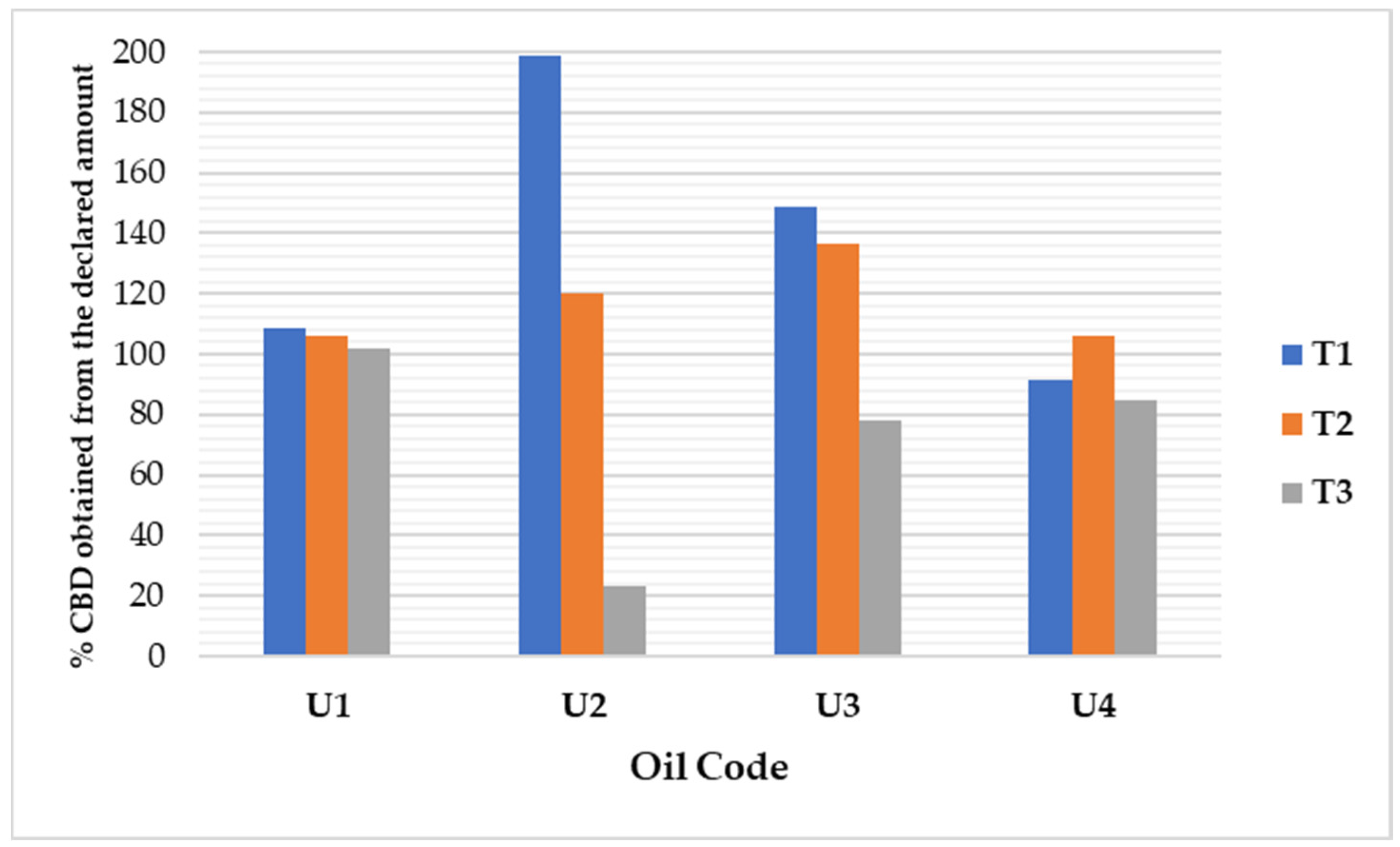 Table 7, a noticeable accumulation also occurred with U2 oil, despite HPLC generally offering better selectivity. However, this was not always the case, as one component at the chosen wavelength (210 nm) interacted with CBD. Although the results for the U3 formulation were closer to the theoretical values, significant deviations remained; additionally, after 3 months, the concentration had nearly halved.