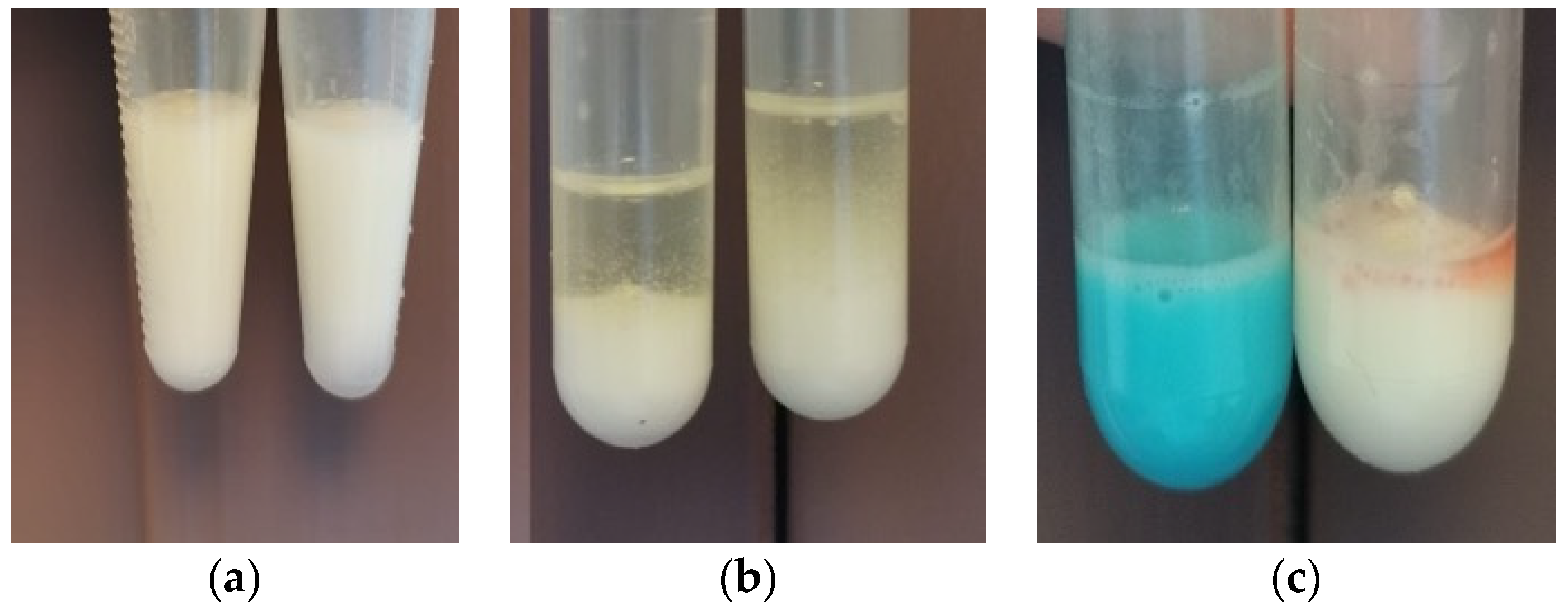 To determine the influence of the preparation method and the amount of emulsifiers used, 5 mL of each emulsion was poured into a 5 mL glass cylinder, and the water volume was measured after 1-, 2-, and 24 h following preparation. Using Equation (1), the stability index was calculated.