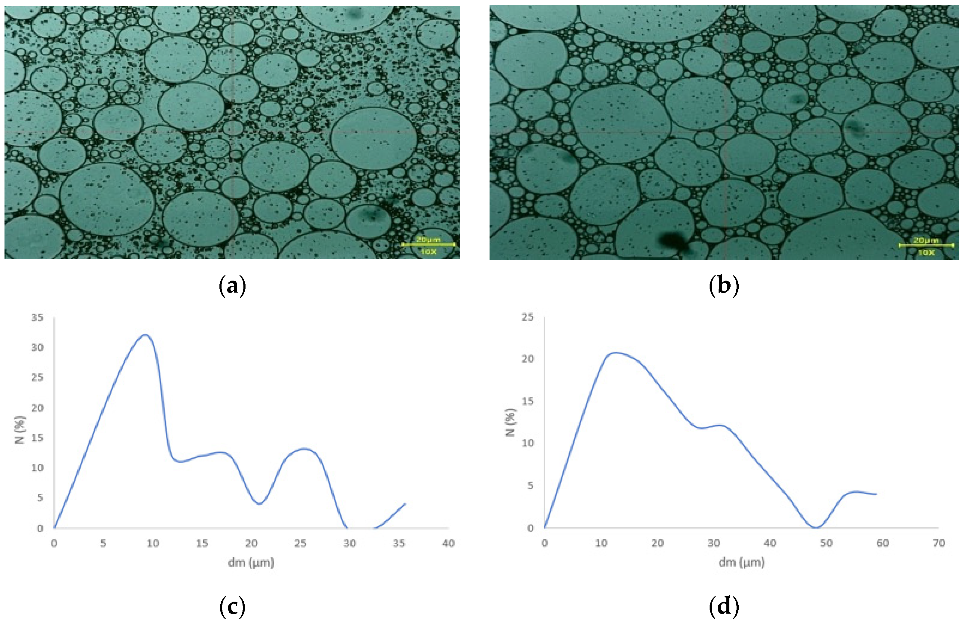 Figure 6a,b. Since a heterogeneous pharmaceutical formulation had been developed, the particle size of the oil droplets can indicate the emulsion’s stability. For better comparison, an unloaded emulsion containing all ingredients except the active ingredient, and a loaded emulsion containing the active ingredient at a concentration of 4.76%, were prepared. Emulsions were obtained in both cases, as the emulsion without the active ingredient showed an average particle size of 10.26 µm (