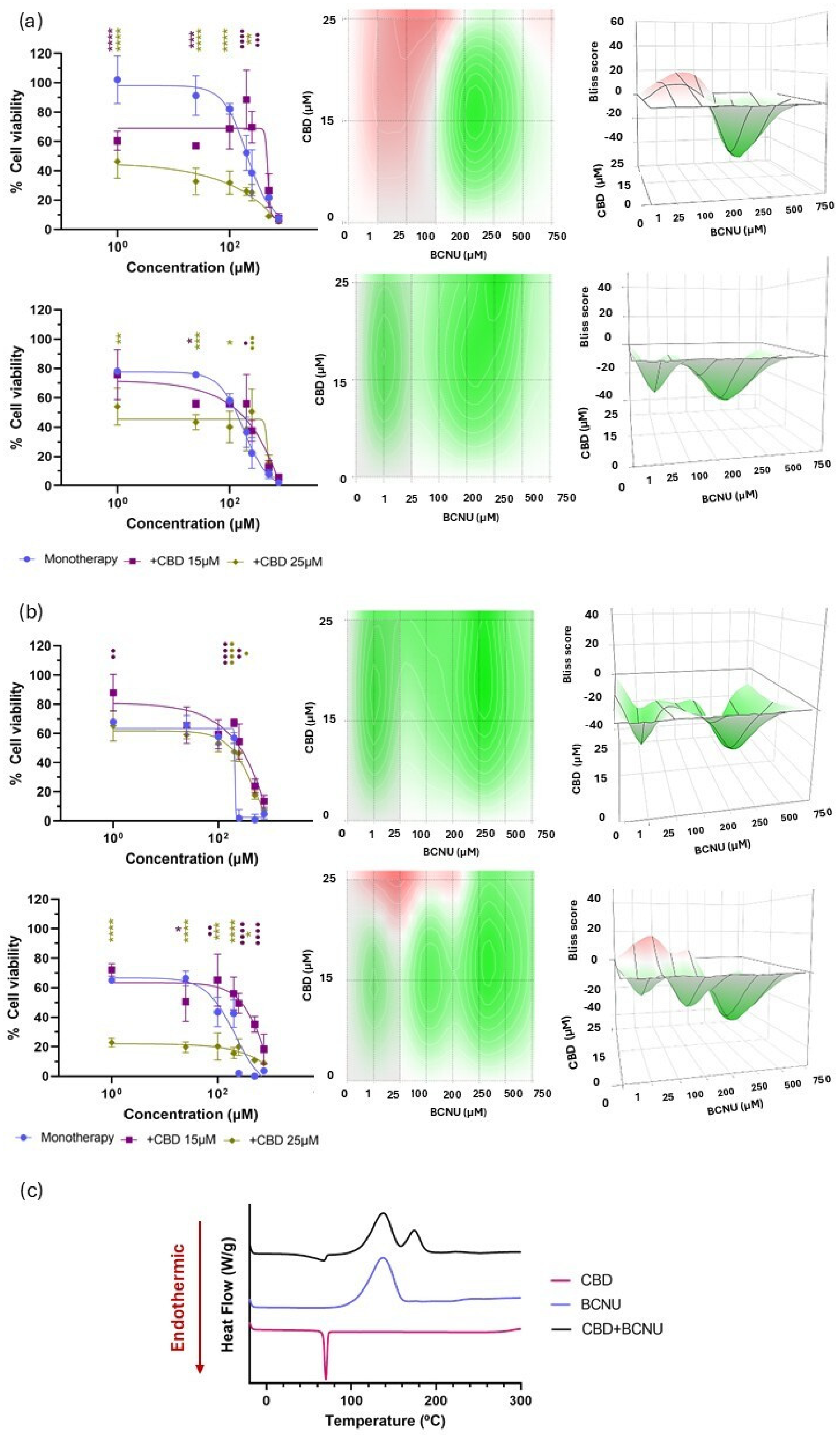 | CBD + BCNU | −2.25 ± 5.42 | −19.10 ± 5.07 | −24.37 ± 4.02 | −9.89 ± 4.23 | – | Biologically antagonistic Chemically incompatible |