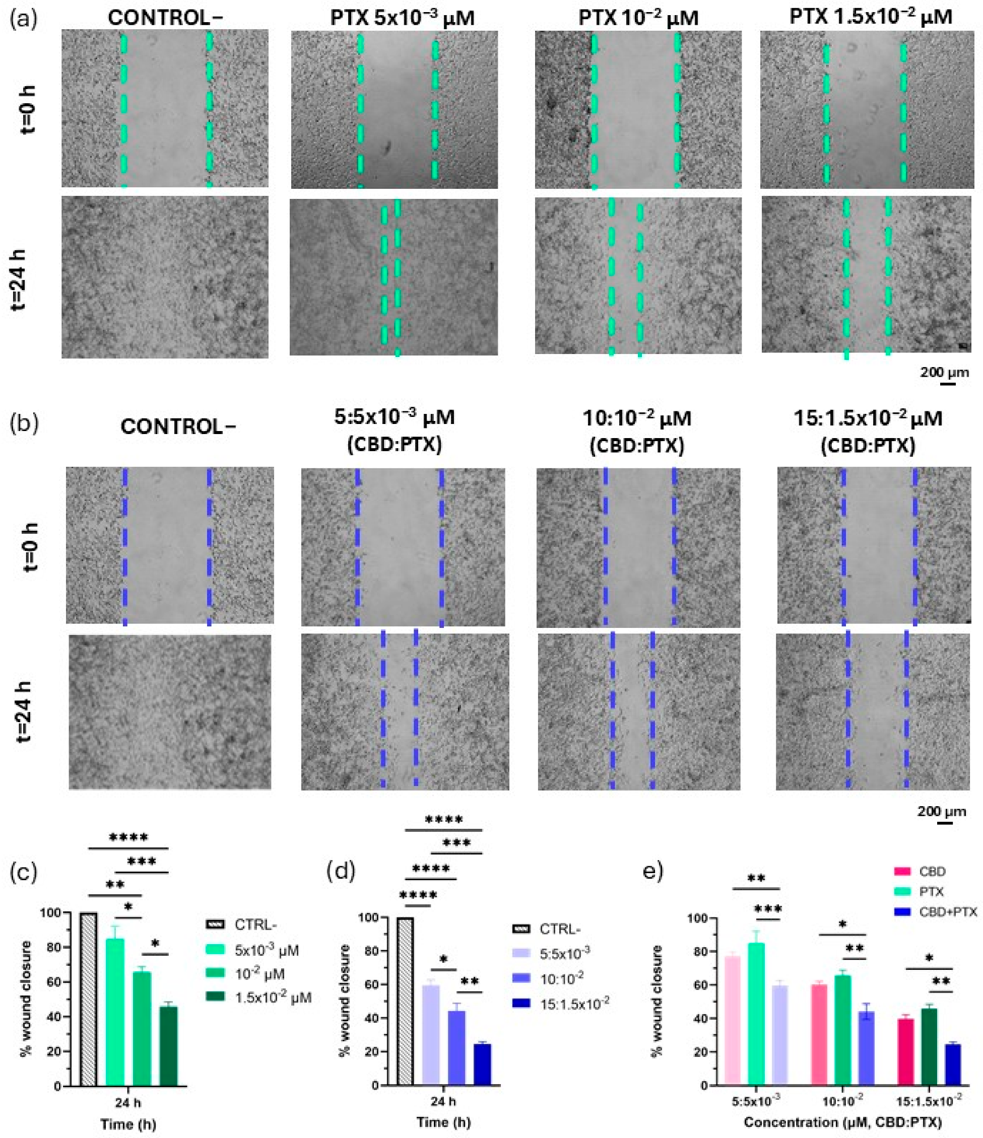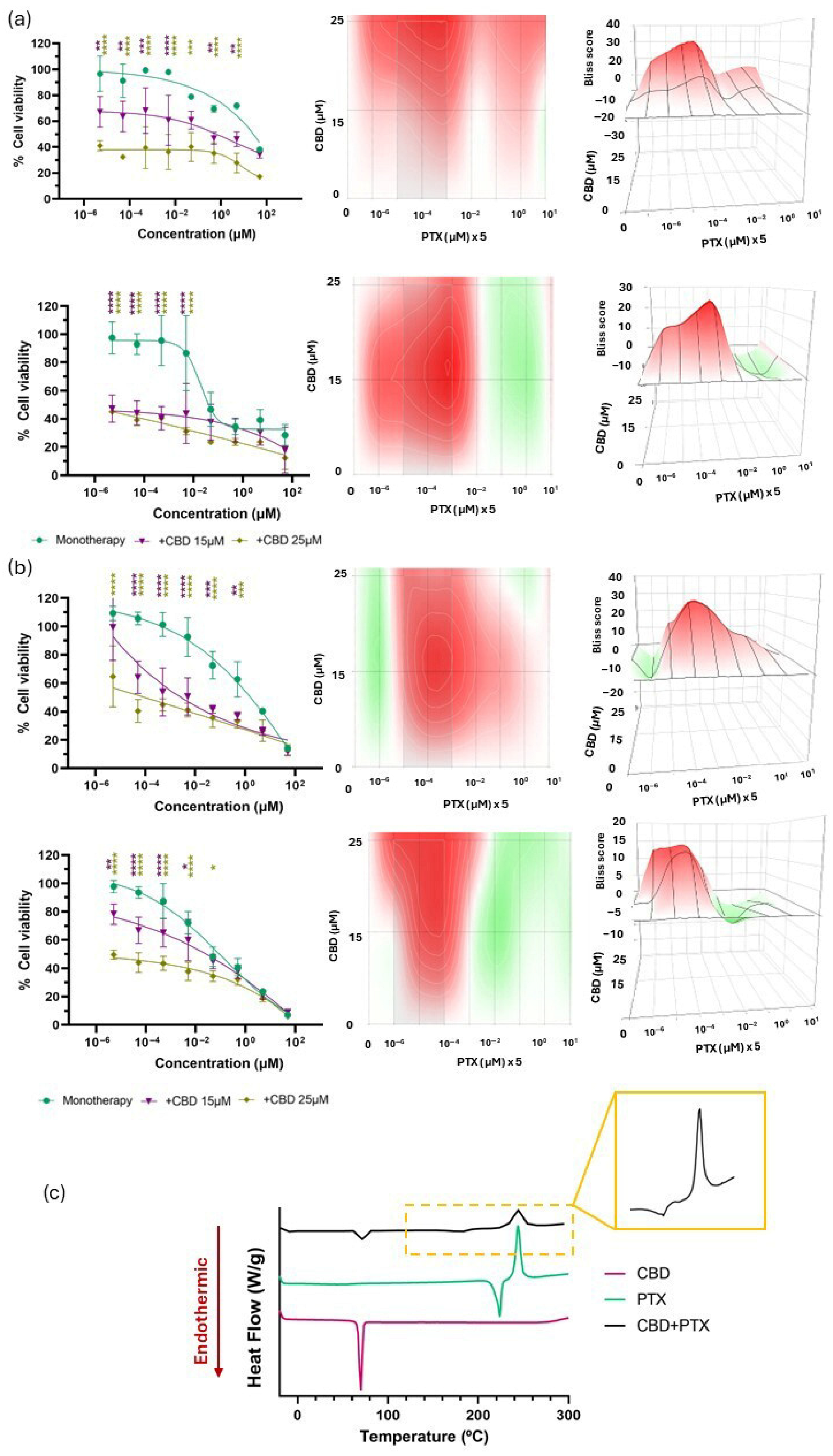 | CBD + PTX | 11.58 ± 5.49 | 6.62 ± 5.49 | 8.08 ± 6.03 | 3.15 ± 3.43 | + | Biologically synergistic No chemical incompatibility detected |