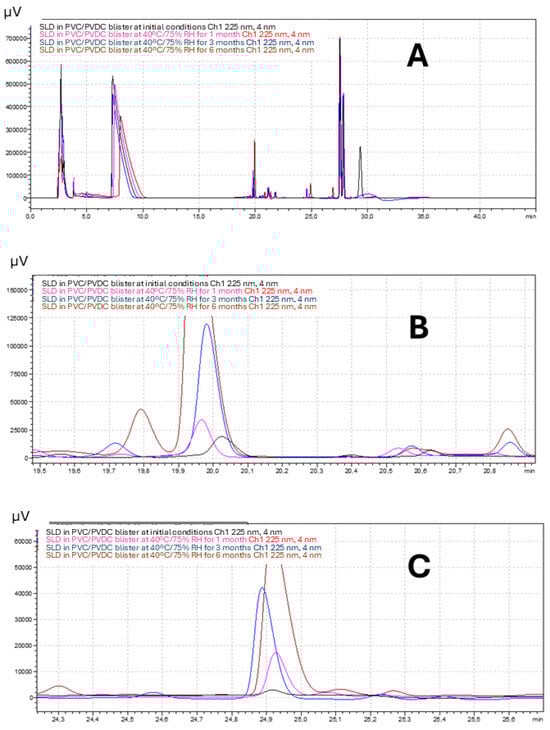 Figure 1A shows a representative superposition of chromatograms corresponding to the SLD formulation packed in PVC/PVDC blister at initial conditions (black) and after storage at 40 °C/75% RH for 1 (pink), 3 (blue), and 6 (brown) months. Retention times for SLD, dehydrosilodosin, and impurity 1 were approximately 8, 20, and 25 min. Figure 1B,C show a magnification of the peaks corresponding to dehydrosilodosin, and impurity 1, respectively.