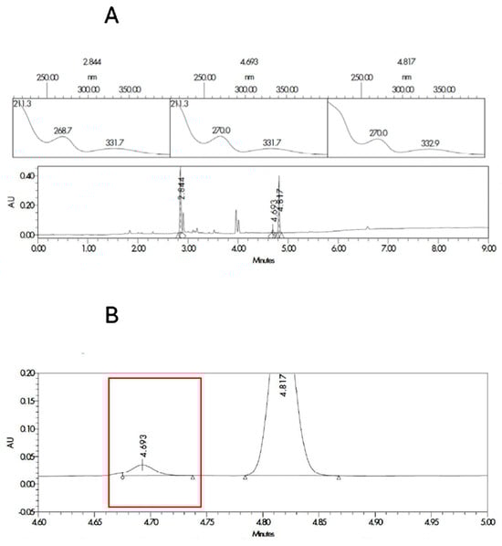 Spectrum index plots and PDA spectrum (A) for the peaks corresponding to SLD (RT 2.8 min and area 748.5 µV·s), impurity 1 (RT 4.7 min and area 29.3 µV·s), and amide synthesized form (RT 4.8 and area 512.2 µV·s). Magnification of the chromatogram at the times related to the impurity 1 (B) marked in red for the sample corresponding to degraded SLD contaminated with the amida form.