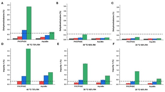 Formation of dehydrosilodosin (A–C) and impurity 1 (D–F) at different storage conditions and times expressed as percentage ± SD. The dotted line shows the specification limit for dehydrosilodosin (<0.6%) and impurity one (<0.3%), respectively. Black colour refers to non-degraded samples (0 months), red colour refers to samples after 1 month storage, blue colour refers to samples after 3-month storage, and green colour refers to samples after 6-month storage.