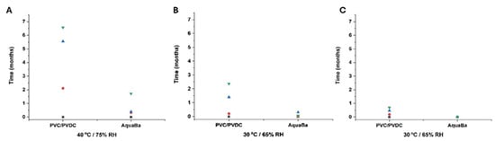 Relative total weight increase in capsules using AquaBa® and PVC/PVDC packing materials at different storage conditions and times (A–C). Black colour refers to non-degraded samples (0 months), red colour refers to samples after 1 month storage, blue colour refers to samples after 3-month storage, and green colour refers to samples after 6-month storage.