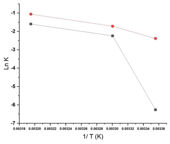where K is the chemical reaction rate; A is a constant referred to as the “preexponential factor”; Ea is the activation energy of the reaction, typically measured in Kcal/mol, that describes the “temperature sensitivity” of the drug; R is the universal gas constant, whose value is 1.987 cal/K·mol; and T is the absolute temperature expressed in Kelvin degrees []. In these studies, the specification limit for dehydrosilodisin was 0.6% and for impurity 1 was 0.3% according to the European Pharmacopeia []; hence, high percentages of degradation were not relevant, and prolonged time points were not taken into consideration.