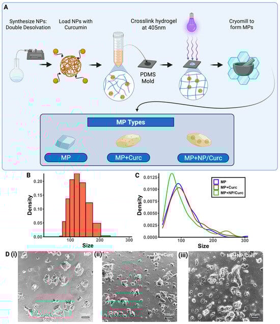 Characterization of MP Scaffolds. (A) Schematic overview of the fabrication process. (B) Size distribution of gelatin NPs. (C) Size distribution of each type of MP. (D) Representative images of each MP configuration (scale bar = 100 μm) (i) MPs, (ii) MPs + Curc100, (iii) MPs + NP/Curc100.