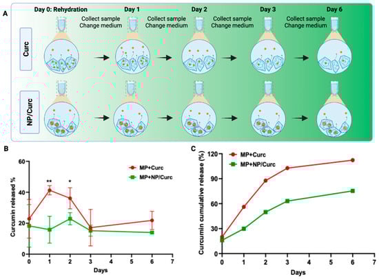 Release profile of curcumin from MPs. (A) Scheme of sample collection at different time points. To mimic a sink condition, all solutions were collected and refreshed at each time point. (B) The percentage of curcumin released into PBS solution over the course of six days. Data shown are mean ± SD n = 4 * p < 0.05, ** p < 0.01. (C) Theoretical cumulative release profile of curcumin. The percentage of release at each time was normalized to the starting mass of curcumin. The cumulative release at each time point was the sum of the time point and all time points preceding it.